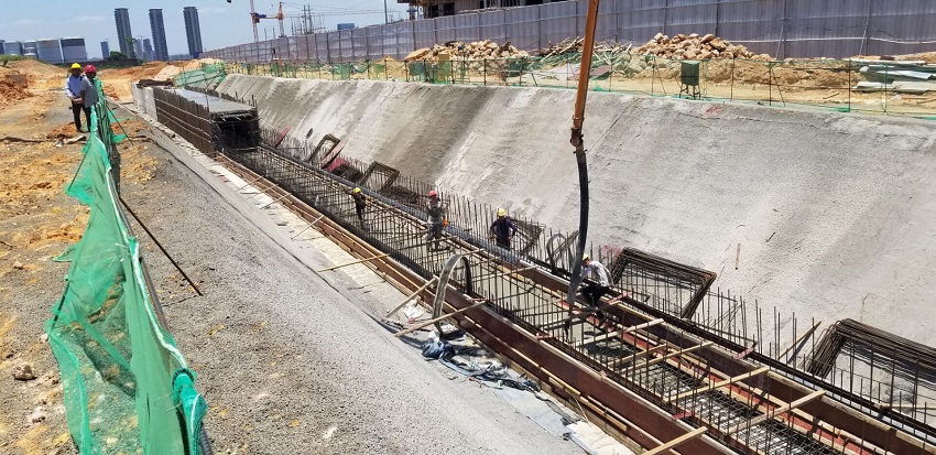 7月26日,旱塘主變電纜廊道現場呈現出熱火朝天的大干場面。指揮部指導工區加大資源投入,精心組織施工,拉開了旱塘主變電纜廊道全面施工的序幕。旱塘主變電纜廊道總長1791.59m,包括頂管段和明挖段,其中頂管施工383.5m,明挖施工1408.09m。截至目前頂管段:1號接收井設計10.735m,累計開挖2.0m;2號始發接收井設計16.924m,累計開挖8.3m;3號井設計25.461m,累計開挖11.5m;4號井設計12.535m,已完成開挖;明挖段溝槽累計開挖120m,底板混凝土澆筑累計完成110m,頂板混凝土澆筑累計完成60m。